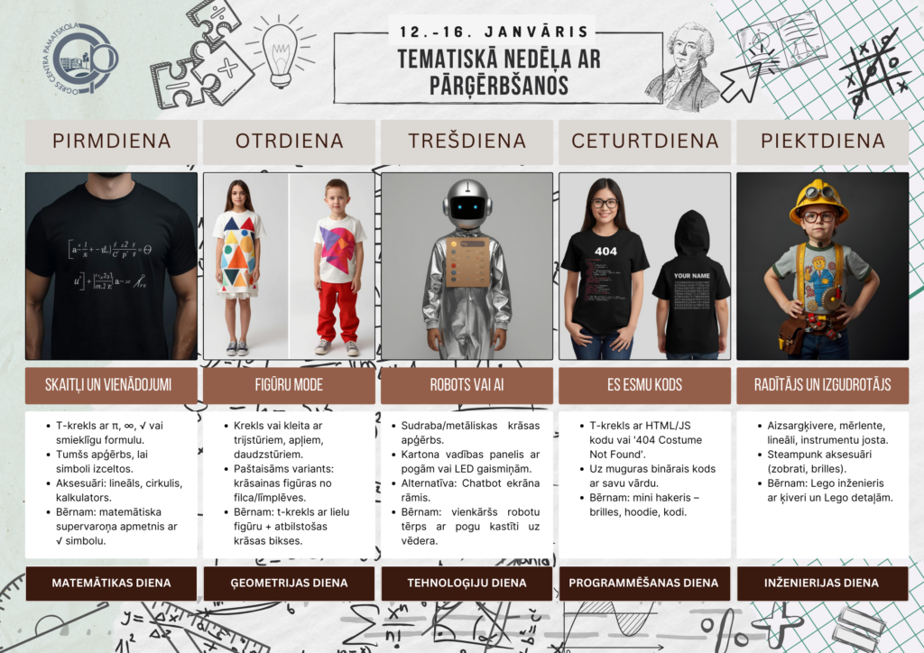 Visa mēneša garumā skolēnus iesaistām aizraujošās aktivitātēs – galda spēļu veidošanā, tematiskajā nedēļā, erudīcijas konkursā “Bingo!”, prāta spēlēs un sacensībās. Matemātika un tehnoloģijas ienāk gan mācību stundās, gan radošos uzdevumos un pat apģērbā, veicinot loģisko domāšanu, sadarbību un zinātkāri.