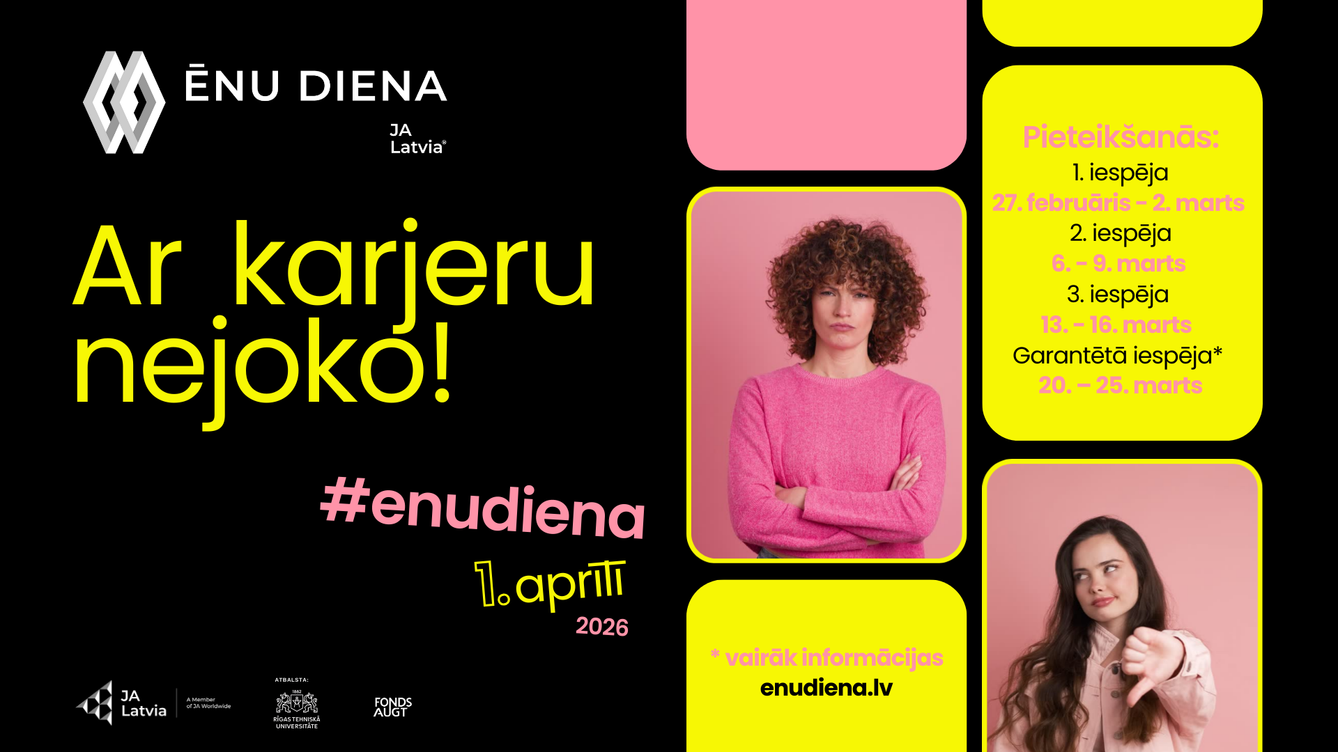Vairāk informācijas par pieteikšanos u.c. jautājumiem skat. www.enudiena.lv . Februārī, īsi pirms skolēnu pieteikšanās sākuma, vietnē enudiena.lv tiks publicēts jaunums - vakanču tests. Vakanču tests ir izveidots, iedvesmojoties no John L. Holland RIASEC modeļa. Aizpildot testu, ar mākslīgā intelekta palīdzību visas enudiena.lv publicētās vakances skolēna profilā būs iespējams sašķirot pēc to atbilstības skolēna testa rezultātiem.