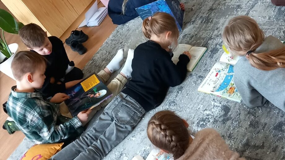 Lasīšanai atvēlēta atsevišķa telpa un, fonā skanot klusai mūzikai, skolēni aicināti lasīt brīvi izvēlētu grāmatu gan sēžot pie galdiem, gan iekārtojoties uz paklāja ar 8.klases skolēnu šūtiem spilventiņiem.