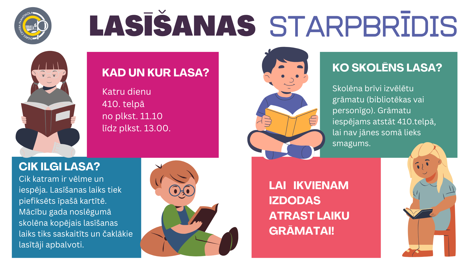 Vai vēlies klusumā attīstīt iztēli, bagātināt vārdu krājumu, labāk izprast pasauli un citus cilvēkus? Skolotāja palīgs Līga Beināre aicina visus skolēnus iesaistīties lasīšanas aktivitātē pusdienu starpbrīžos!