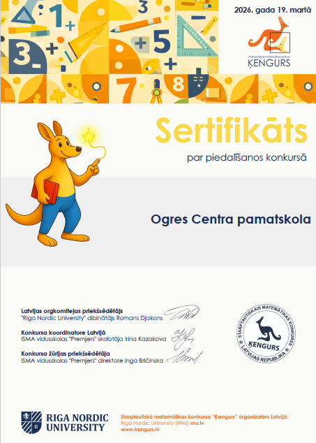 Martā norisinājās starptautiskais matemātikas konkurss “Ķengurs”, kurā skolēniem no 2.-9. klasei bija iespēja pierādīt sevi risinot matemātiskus dažāda līmeņa uzdevumus. Paldies skolēniem, kuri piedalījās un piedalīšanās šādā konkursā jau pati par sevi ir liels sasniegums, jo tā apliecina jūsu neatlaidību un interesi par mācīšanos. Apsveicam Emīlu Zemīti (7.a, 17.vieta) un Līgu Mauriņu (9.g , 4.vieta) ar iegūtajām vietām Latvijas skolu TOP 20 arī PALDIES skolotājām! Lepojamies ar Jums un novēlam vēl daudz panākumu turpmāk!