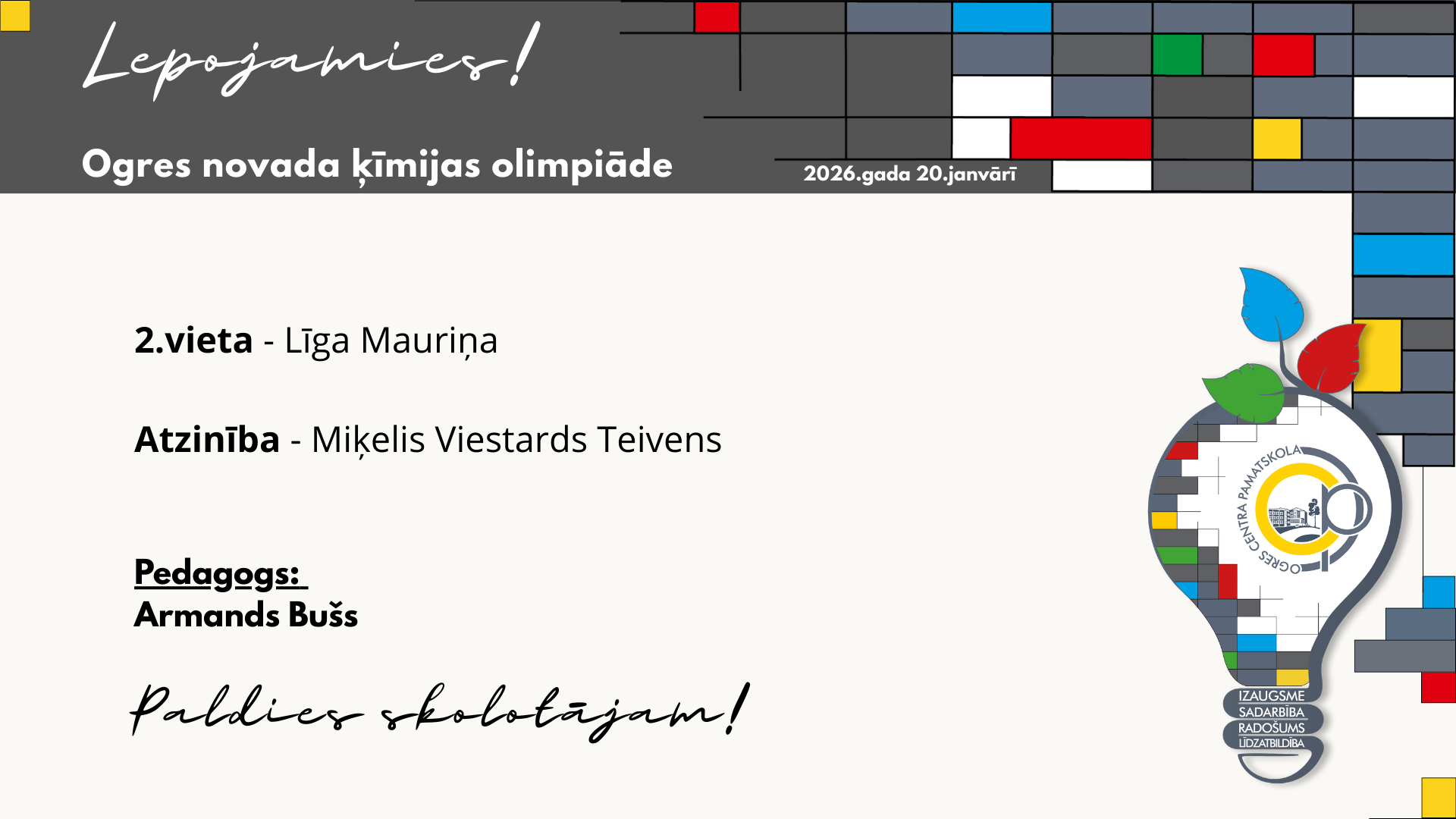 Ogres novada ķīmijas 67. olimpiādē 9. klasēm, kas notika 20. janvārī, 2.vietu ieguva Līga Mauriņa, atzinību - Miķelis Viestards Teivens. Paldies skolotājam Armandam Bušam par skolēnu sagatavošanu!