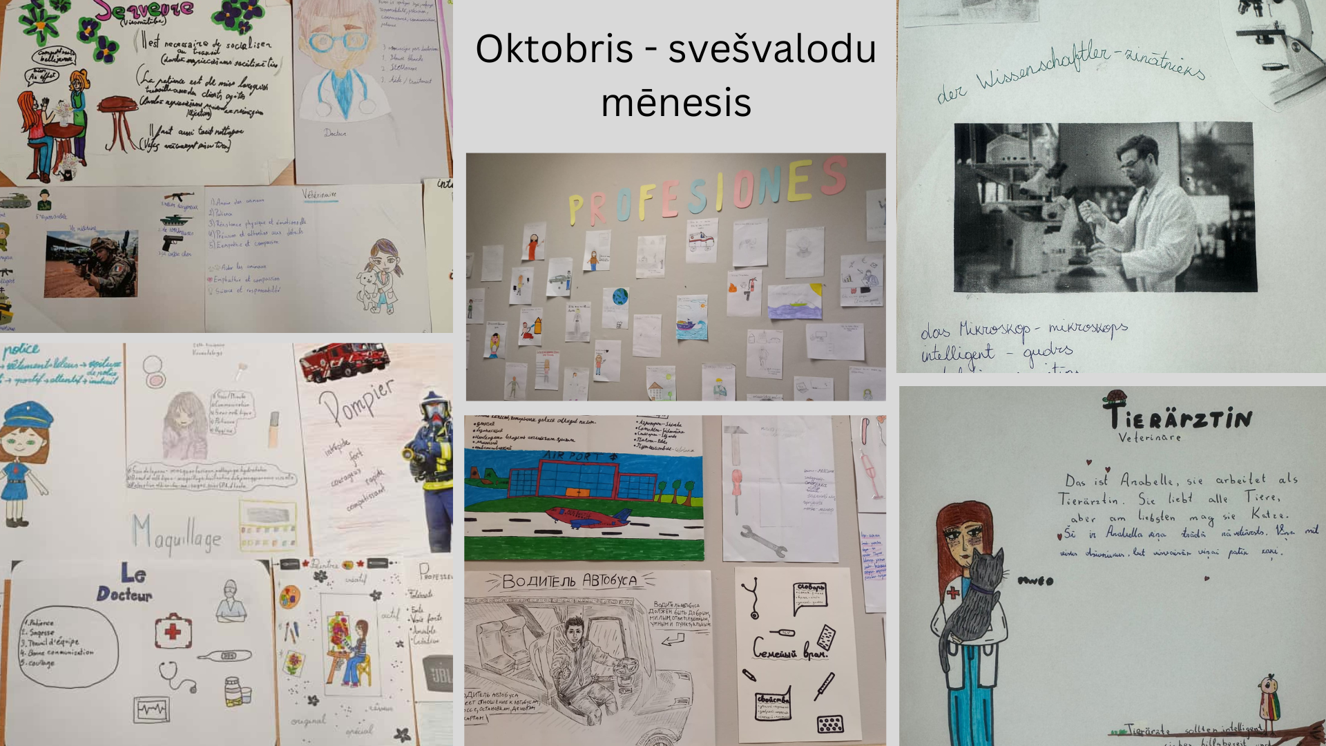 Svešvalodas mēneša tēma "Profesijas" piedāvā 4. - 6.kl. skolēniem lielisku iespēju iepazīt un pārdomāt savus mērķus un sapņus. Šogad, veidojot kolāžas par profesijām dažādās valodās - krievu, spāņu, vācu un franču - secinām, cik dažādi var izpausties cilvēka vēlmes attiecībā uz nākotni. Katras valodas un kultūras skatījums uz profesijām sniedz jaunas perspektīvas un idejas. Veidojot kolāžas par profesijām, skolēni iepazina dažādas profesijas un karjeras iespējas. Šī tēma mudina skolēnus iedomāties, kādas profesijas varētu izvēlēties nākotnē, un kā tās varētu atbilst interesēm, prasmēm un vēlmēm.