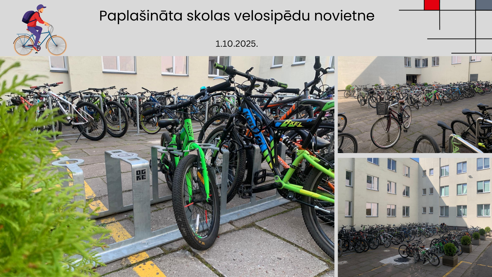 Sagaidot jauno mācību gadu, Ogres Centra pamatskolas pagalmā veikta esošās velosipēdu novietnes paplašināšana, t.sk. uzstādīti velosipēdu novietošanas statīvi papildus vismaz 40 velosipēdu ērtākai un drošākai novietošanai.