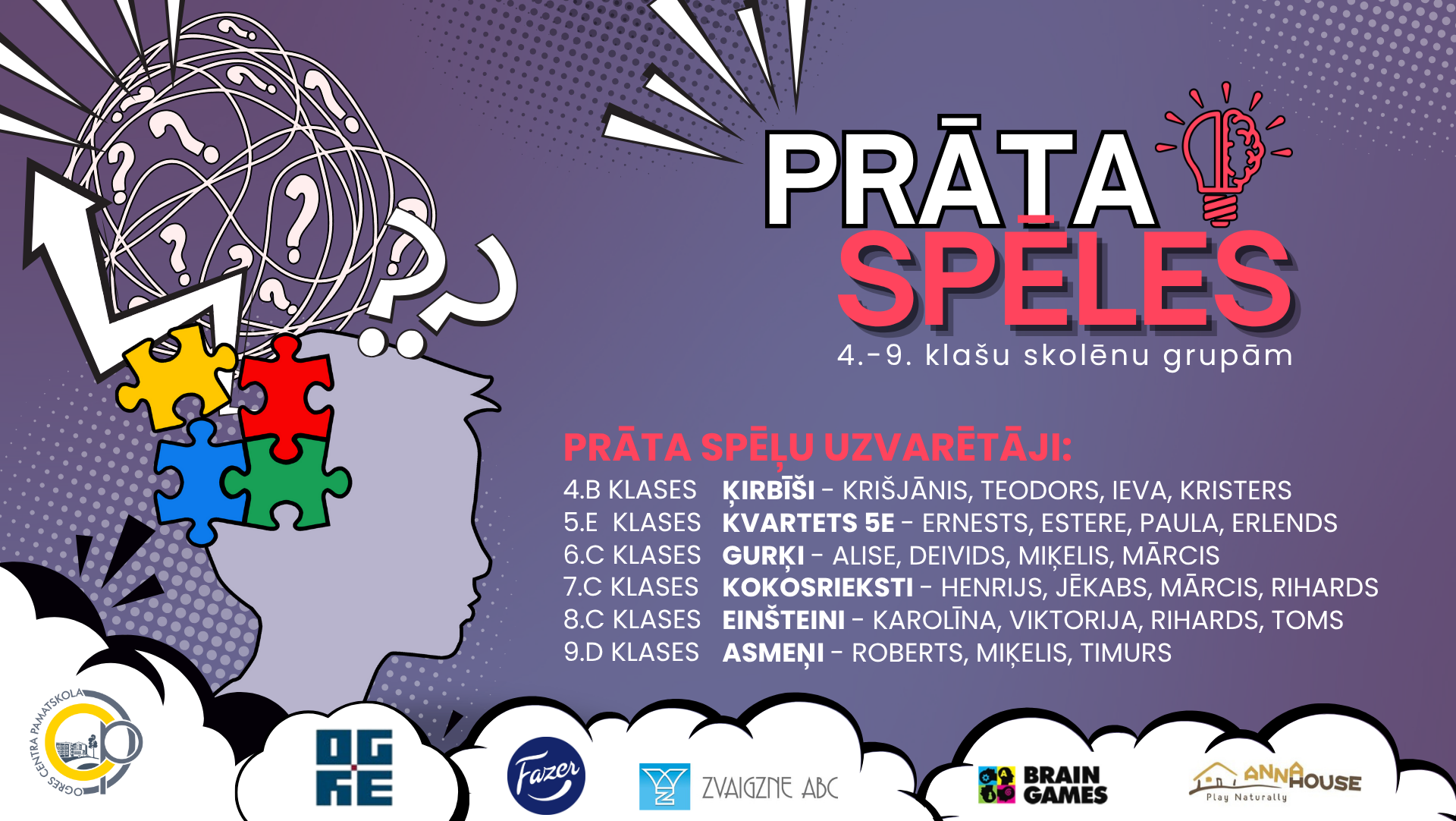Ir tapis neliels "Prāta spēļu" atskata video. Prāta spēles notika 4.-9. klasēm, no 27.-31. oktobrim, sadarbībā ar OCP vecāku atbalsta biedrību, piedaloties Ogres Centra pamatskolas, Ogres Kalna pamatskolas, Jaunogres pamatskolas un Edgara Kauliņa Lielvārdes vidusskolas skolēniem.