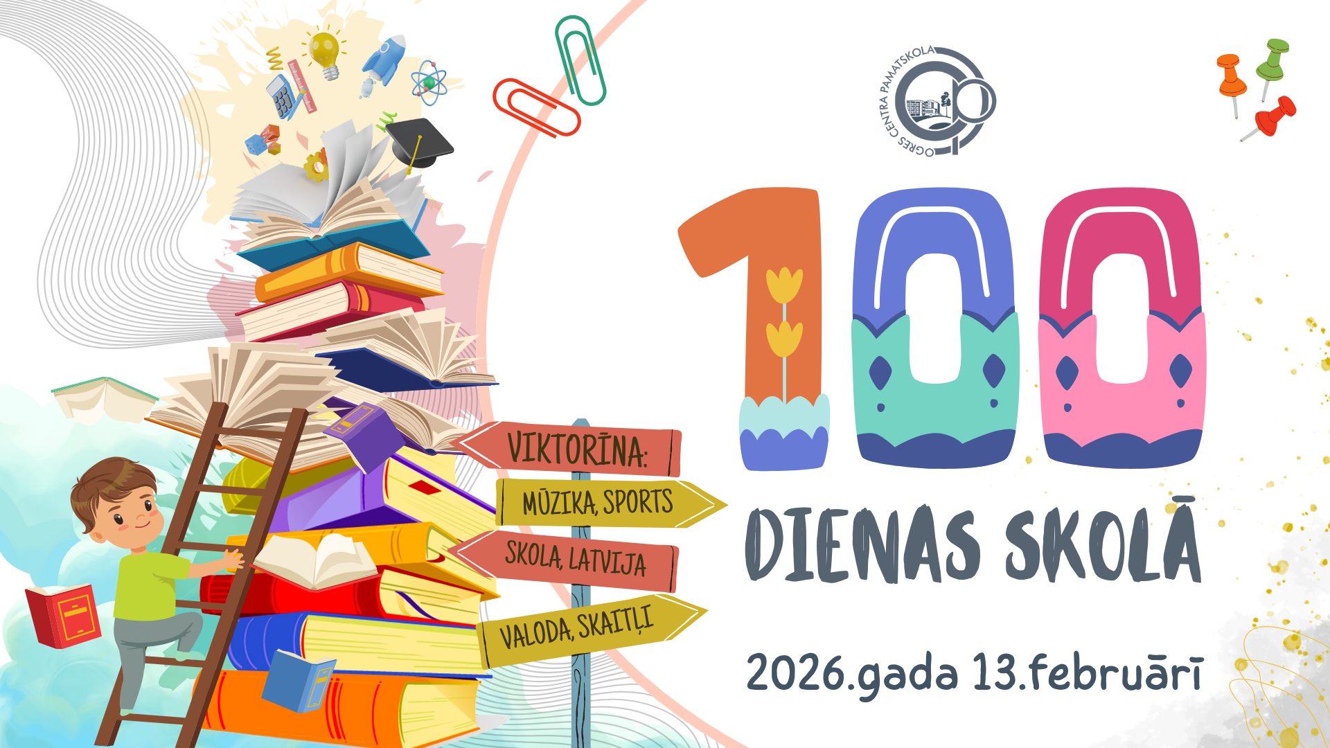 Šodien mūsu skolas gaiteņos virmoja īpašs prieks! 1.klašu skolēni svinēja 100. dienu skolā! Tas ir brīdis, kad pirmklasnieki no nedrošiem iesācējiem ir kļuvuši par īstiem Ogres Centra pamatskolas saimes skolēniem. Svētkus ieskandināja 1.klašu koris un tad turpinājās izzinoša viktorīna. Tā nebija tikai zināšanu pārbaude, bet gan īsts komandas darbs. Bērni rādīja, cik labi viņi māk sadarboties, apspriesties un ieklausīties viens otrā, lai kopīgi nonāktu pie pareizās atbildes. Emocijas sita augstu vilni – katra pareizā atbilde tika sagaidīta ar ovācijām un prieka saucieniem! Starp viktorīnas daļām skatuvi pārņēma katras klases sagatavotie priekšnesumi. Šīs radošās pauzes bija kā mazas atelpas brīži, kuros bērni rādīja, ka prot ne tikai rēķināt un rakstīt, bet arī būt īsti mākslinieki - kāds rādīja ritmiskus deju soļus; cita klase vienojās kopīgā, skanīgā dziesmā; tika stāstītas anekdotes, kas veltītas skolas tēmai.