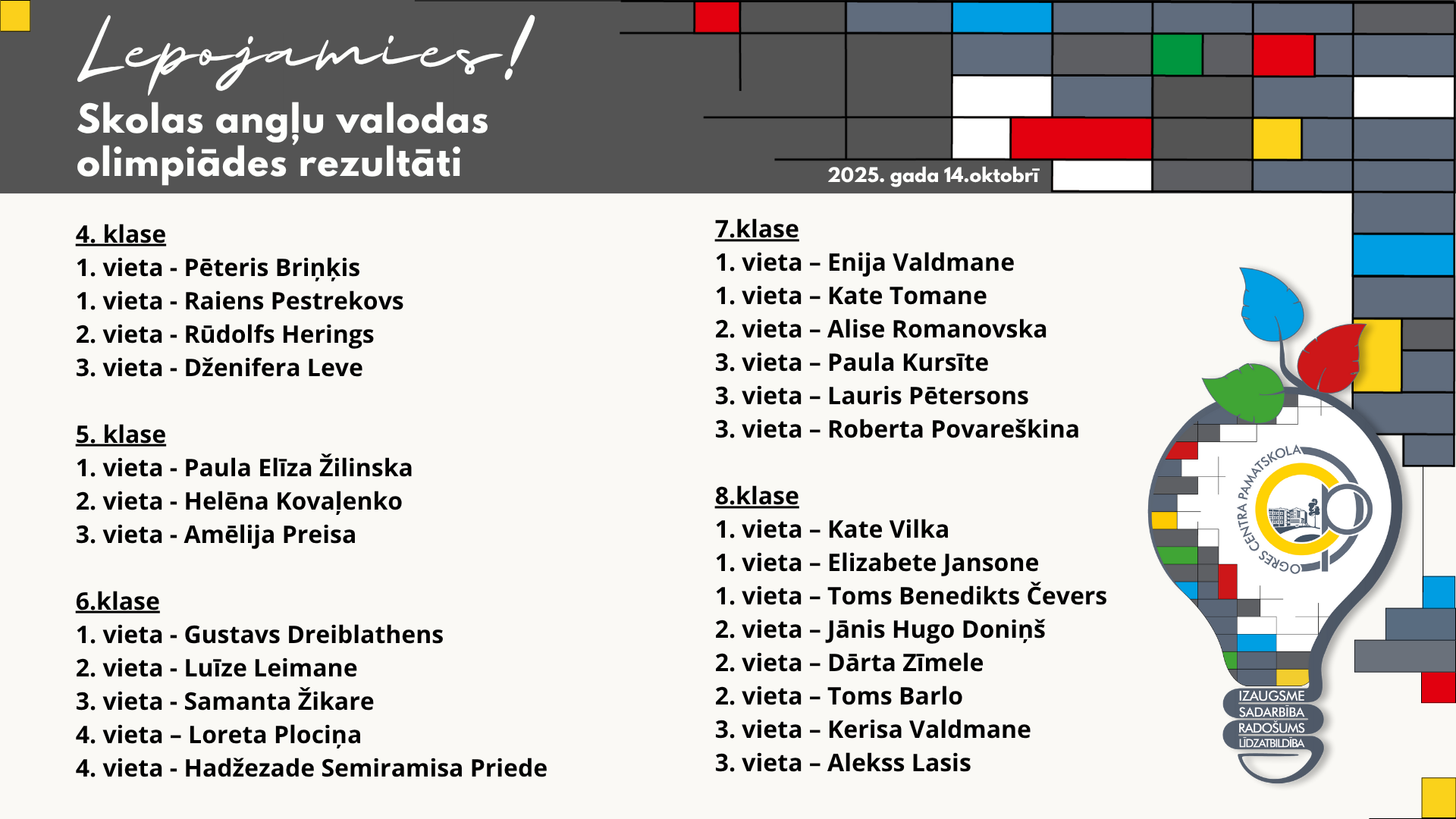Vēlamies apsveikt 4. – 6. un 7. – 8. klašu angļu valodas olimpiādes 1. kārtas uzvarētājus! Šie skolēni pārstāvēs mūsu skolu novada olimpiādē.