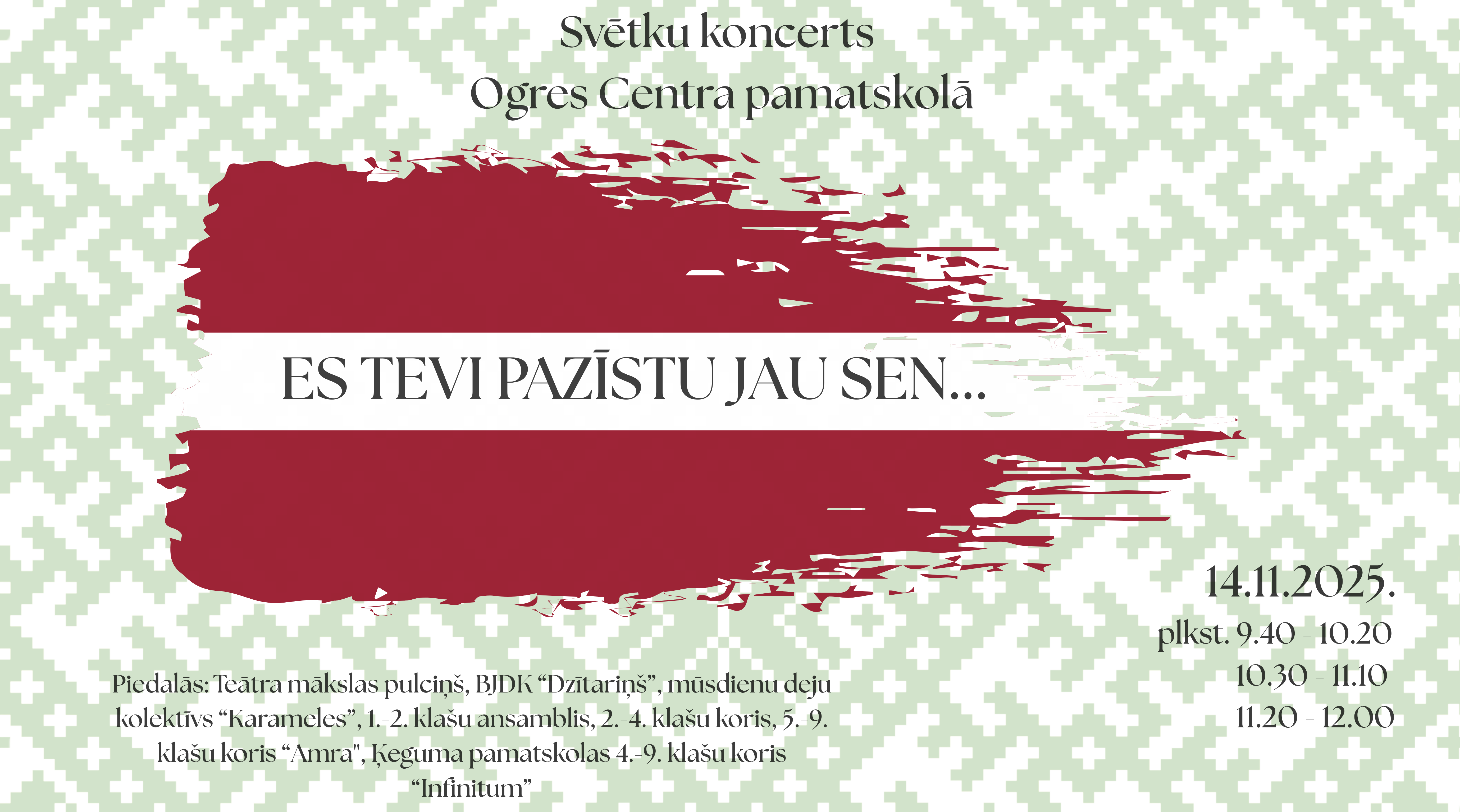 14. novembrī skolas aulā notiks LR proklamēšanas 107. gadadienai veltīti svētku koncerti skolēniem "Es tevi pazīstu jau sen...".