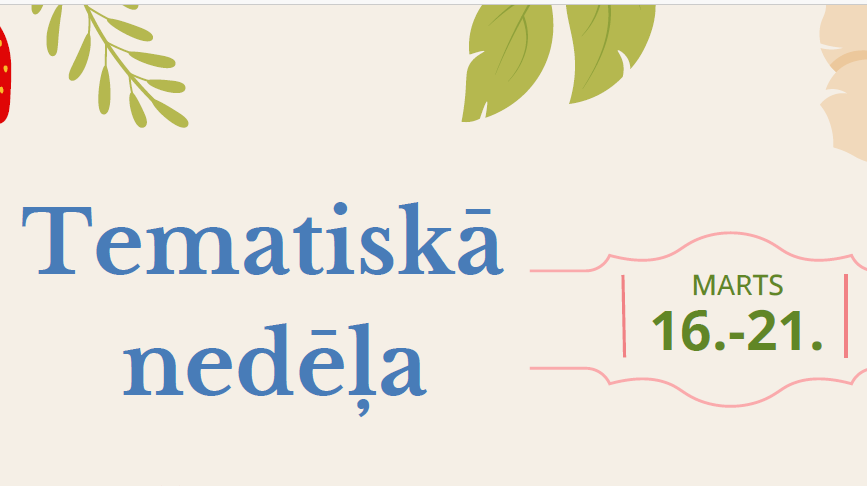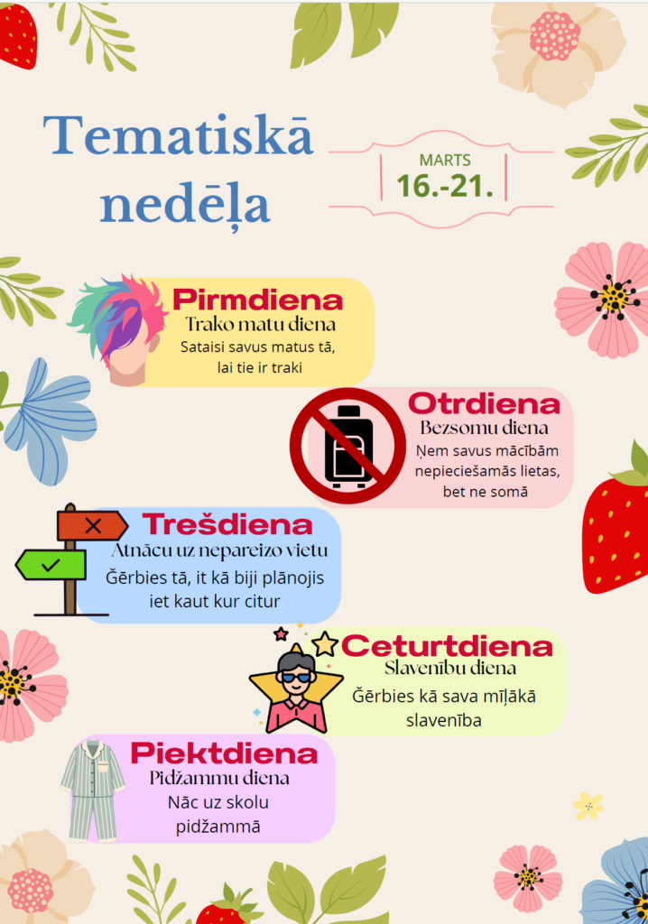 Skolēnu pašpārvalde aicina visus skolēnus un skolotājus, atgriežoties skolā pēc pavasara brīvlaika, no 16. līdz 21. martam piedalīties Tematiskajā nedēļā un katru dienu ģērbties atbilstoši dienas tēmai!