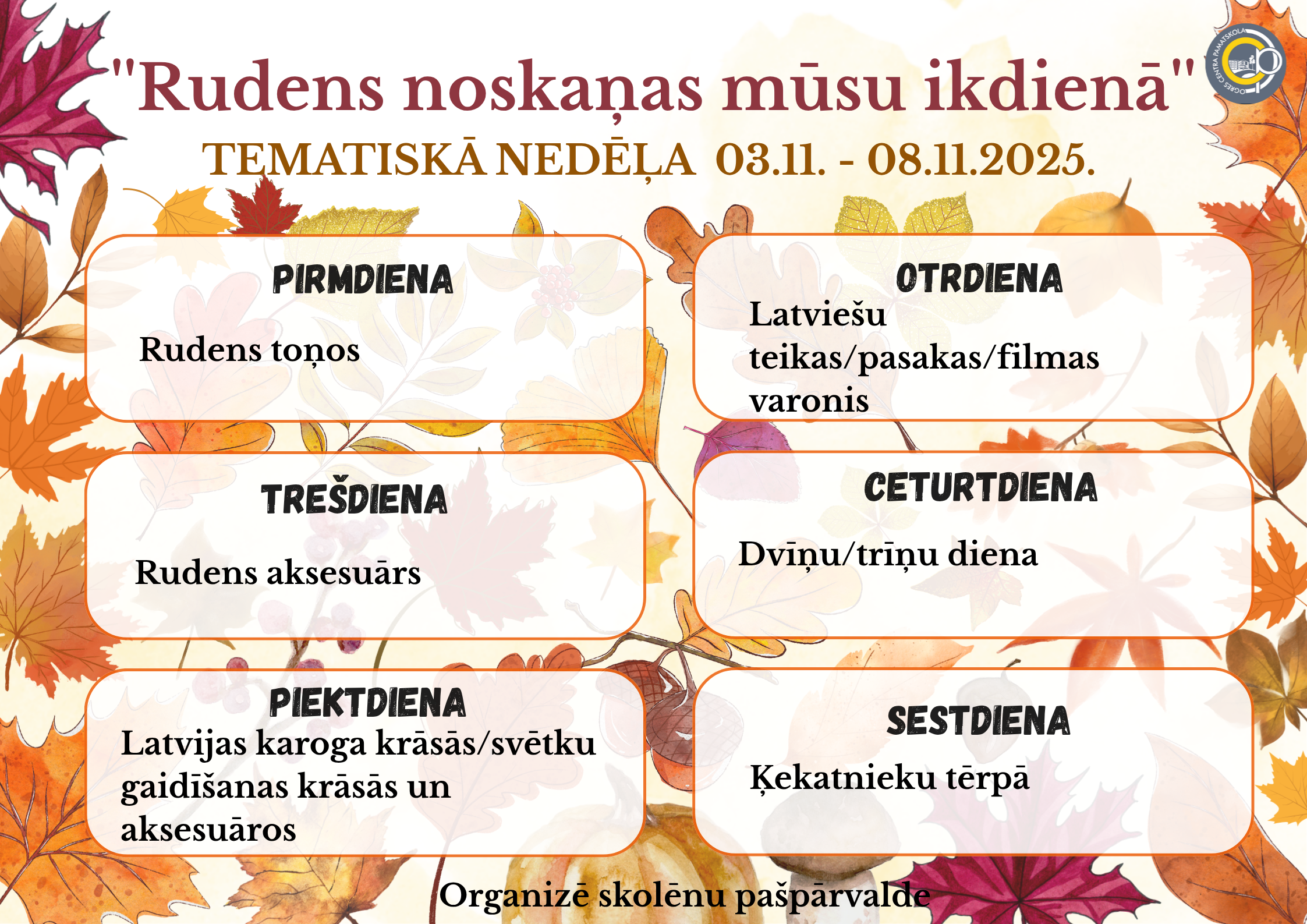 Skolēnu pašpārvalde aicina visu klašu skolēnus, skolotājus un skolas darbiniekus padarīt skolas ikdienu krāsaināku un interesantāku, piedaloties tematiskās nedēļas pasākumā “Rudens noskaņas mūsu ikdienā”, kas notiks no 3. līdz 8. novembrim.