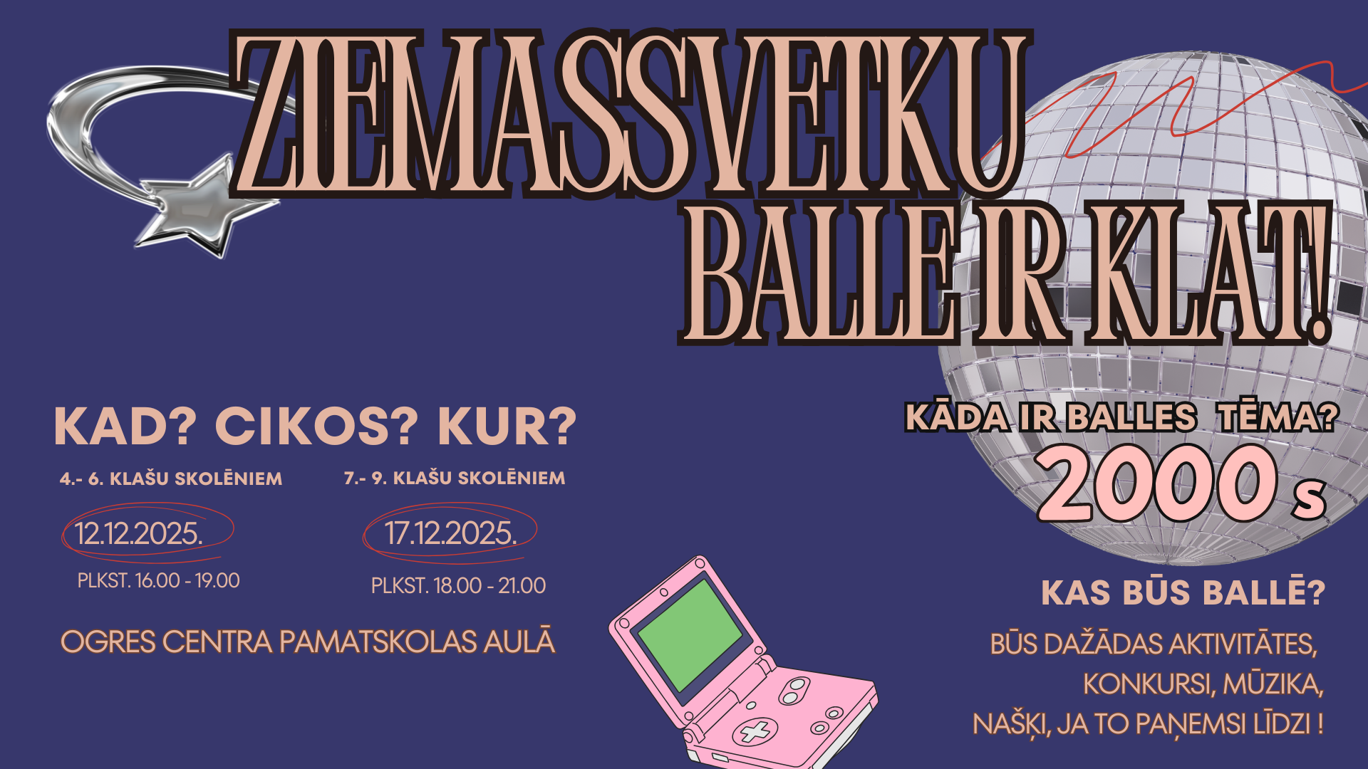 Ogres Centra pamatskolas Skolēnu pašpārvalde aicina tieši tevi, Ogres Centra pamatskolas skolēn, un tavus klasesbiedrus uz Ziemassvētku balli, kas notiks: